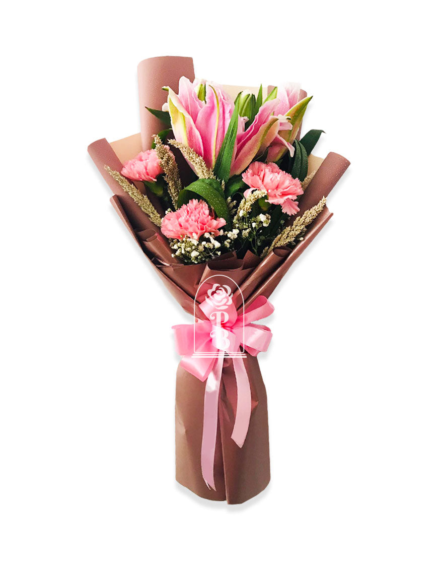 Bouquet of carnations and lilies, elegantly arranged with non-woven fabric.